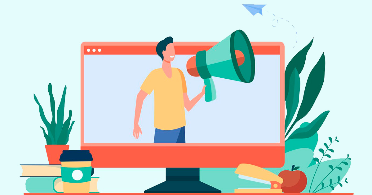 A imagem é uma ilustração colorida que mostra uma tela de computador com uma pessoa dentro dela. A pessoa está segurando um megafone, como se estivesse fazendo um anúncio. Ao redor da tela do computador, há elementos de escritório e plantas.