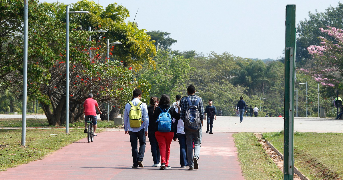 Estudantes caminhando num campus universitário