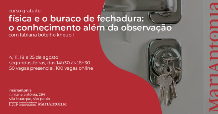 O Centro MariAntonia da USP realiza a partir de 4 de agosto o curso gratuito Física e o buraco de fechadura: o conhecimento além da observação. Ministrado pela professora Fabiana Botelho Kneubil, é dividido em quatro encontros presenciais, sempre às segundas-feiras, das 14h30 às 16h30.