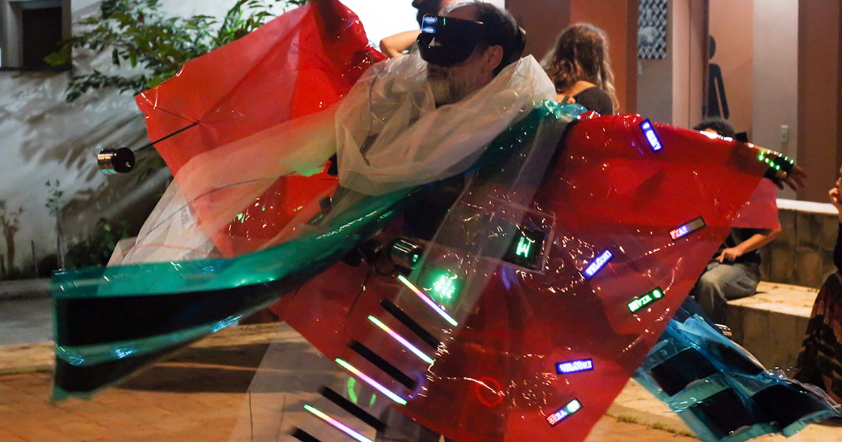 Artista em cena, com traje colorido e luminoso da peça Entre Irmãos