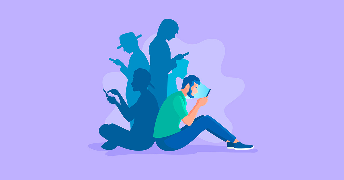 Fotomontagem na qual se vê um grupo de jovens atentos a seus respectivos celulares - uns estão sentados e outros, de pé