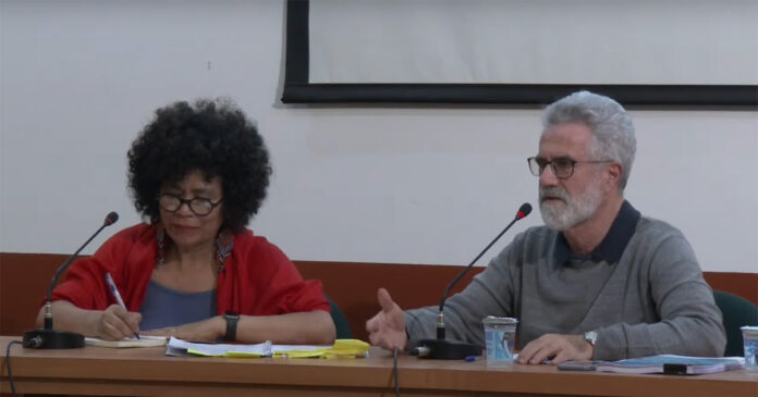 O primeiro encontro do colóquio teve dois momentos. A primeira mesa contou com a presença dos professores Sônia Kruppan, da FE, e Marco Akerman, da Faculdade de Saúde Pública (FSP) da USP, além da coordenadora geral de Articulação Intersetorial do MEC, Gesuína Leclerc. Ela integra a equipe da Secretaria de Articulação Intersetorial e com os Sistemas de Ensino (Sase) do MEC. O Sase havia sido extinto em 2019 durante o governo Bolsonaro, mas foi recriado após o decreto nº 11.342 de 2023, assinado pelo presidente Lula.