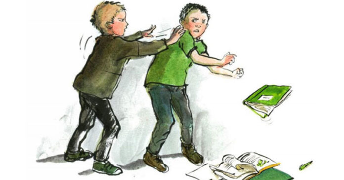 Ilustração que mostra um estudante empurrando um colega pelas costas e jogando seu material escolar no chão