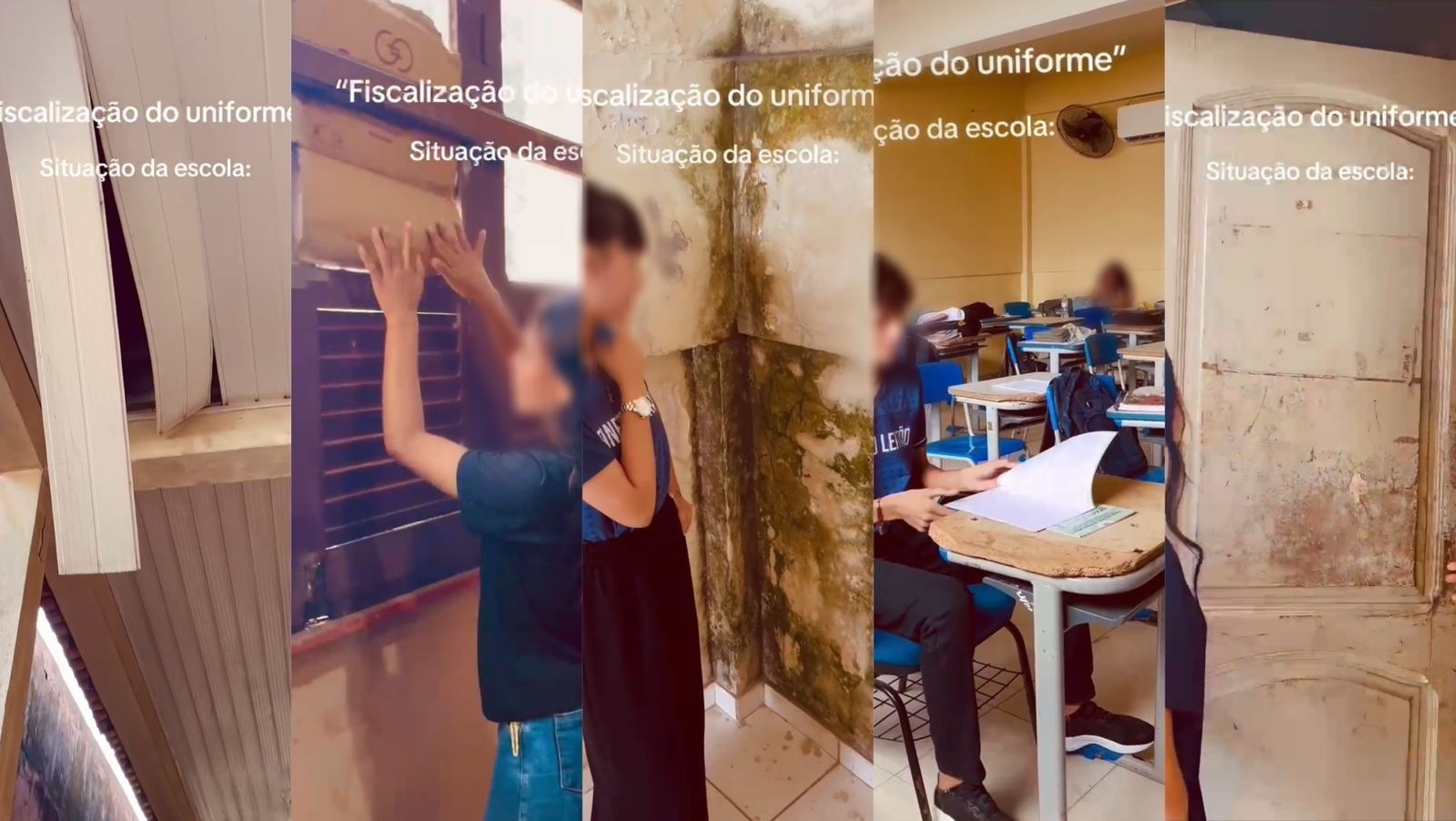 O vídeo mostra o forro cedendo prestes a desabar. Janelas improvisadas, algumas cobertas com papelão e outras fechadas com ripas de madeira.