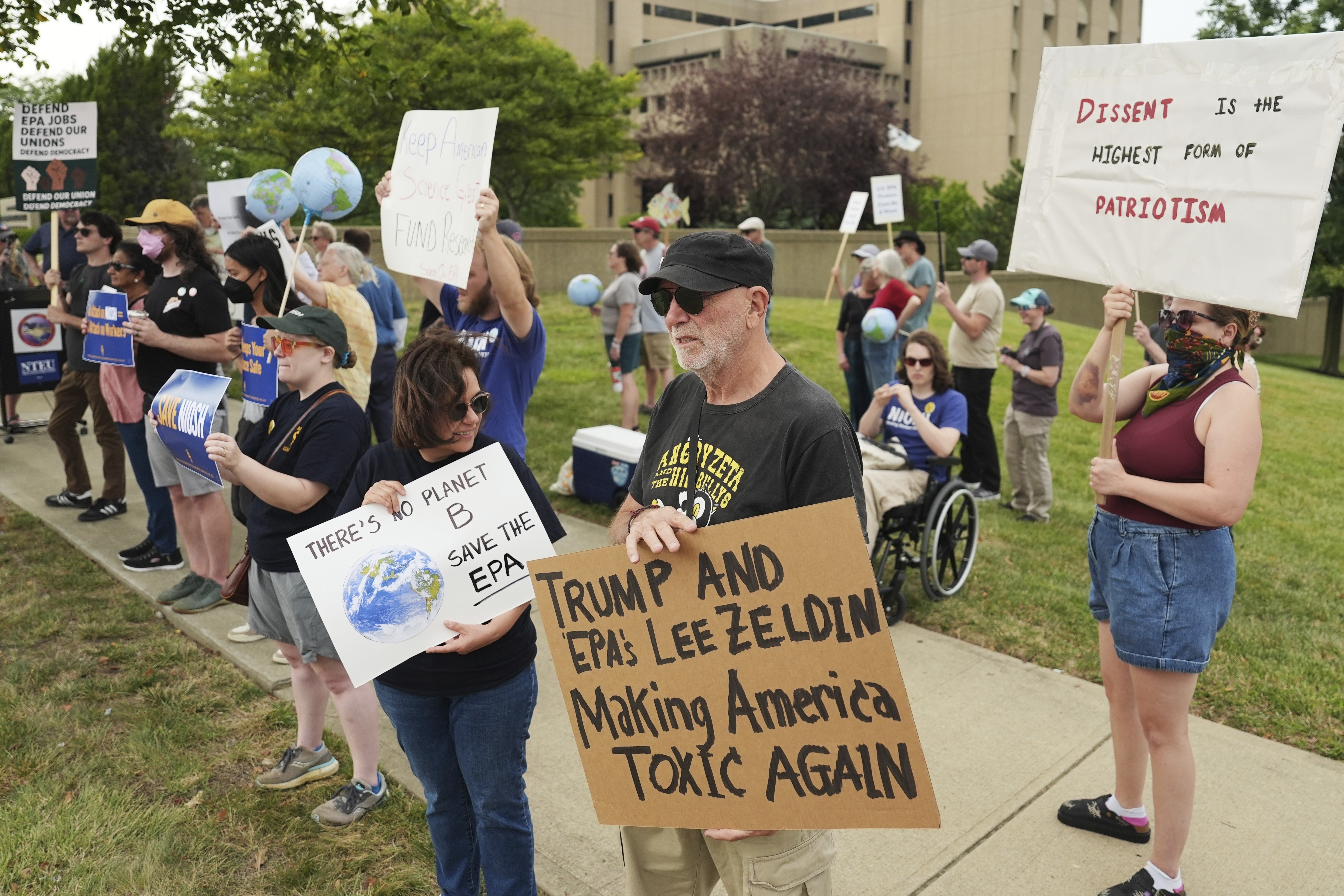 Manifestantes se reúnem em frente a um escritório da Agência de Proteção Ambiental dos EUA (EPA) em apoio aos seus funcionários, em 5 de setembro de 2025, em Cincinnati.