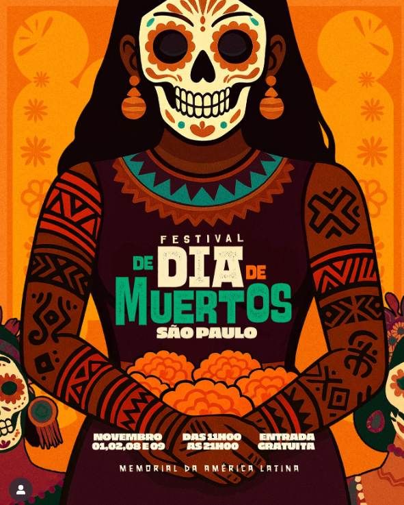 Acontece nos dias 01, 02, 08 e 09 de novembro de 2025, o Festival de Dia de Muertos em São Paulo. A celebração será no Memorial da América Latina, ao lado do Metrô Barra Funda, na capital paulista. O festival será das 11h às 21h. A entrada é gratuita.