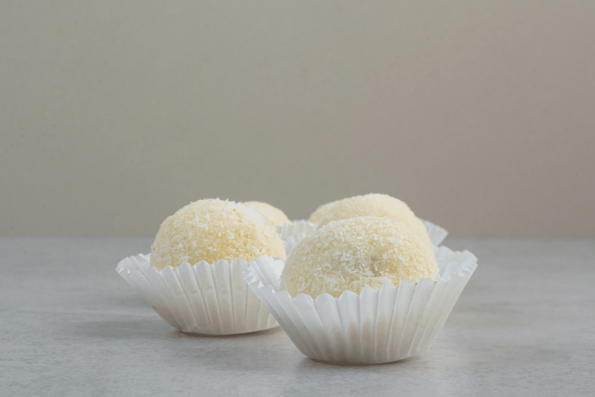 - Unte as mãos com manteiga, enrole os docinhos e passe no coco ralado.
