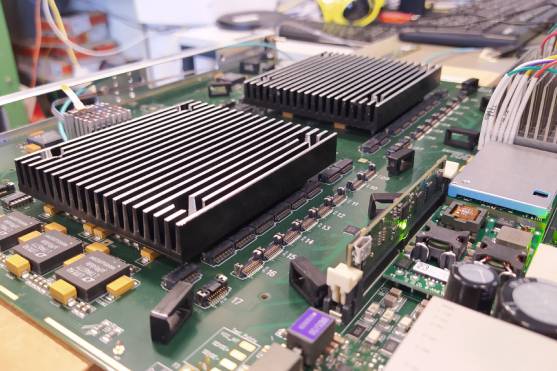 Imagem acima: placa OpenIPMC (na frente) instalada em uma placa Apollo, que será utilizada no CMS. Crédito: Luigi Calligaris