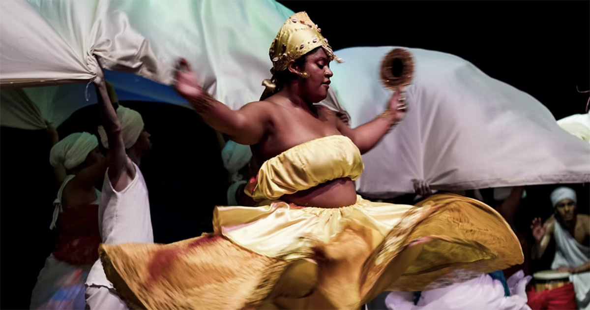 Artista negra dança durante espetáculo. Seu traje é formado por um top tipo tomara-que-caia, uma saia rodada, uma coroa africana e um espelho de mão, todos eles dourados. Ao fundo, pessoas usando turbantes brancos levantam um grande tecido branco. No canto inferior direito da foto, uma pessoa vestindo túnica e turbante brancos toca atabaque.O Grupo Ewé organiza o Àwári desde 2015. Na segunda edição, o grupo fez uma apresentação do espetáculo Ile Ti Örun, com representações de orixás – Foto: Nrishi Mahe